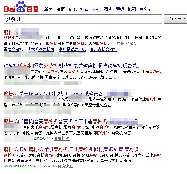 而百度查詢“磨粉機”則是在第五位:磨粉機真實排名